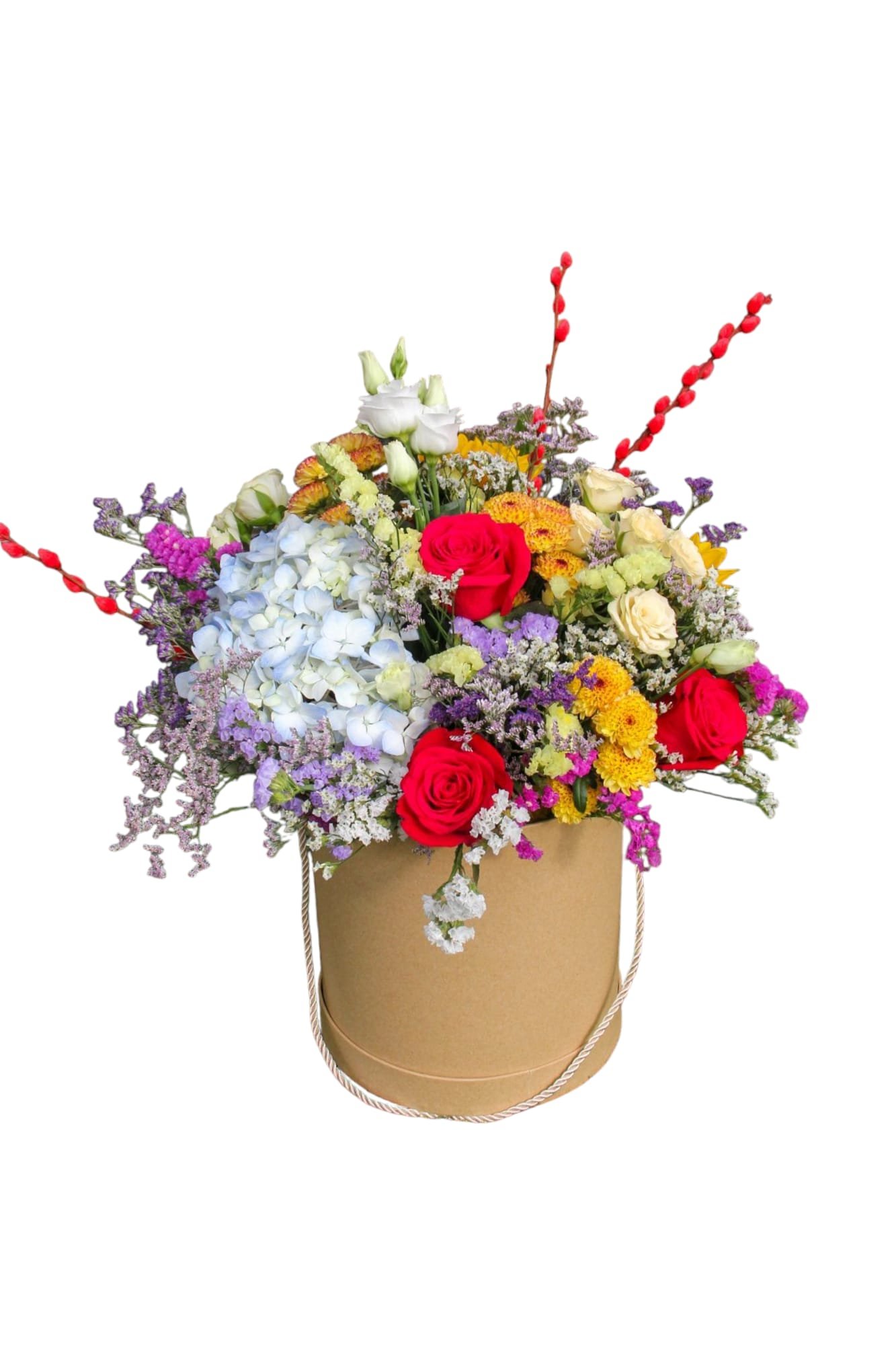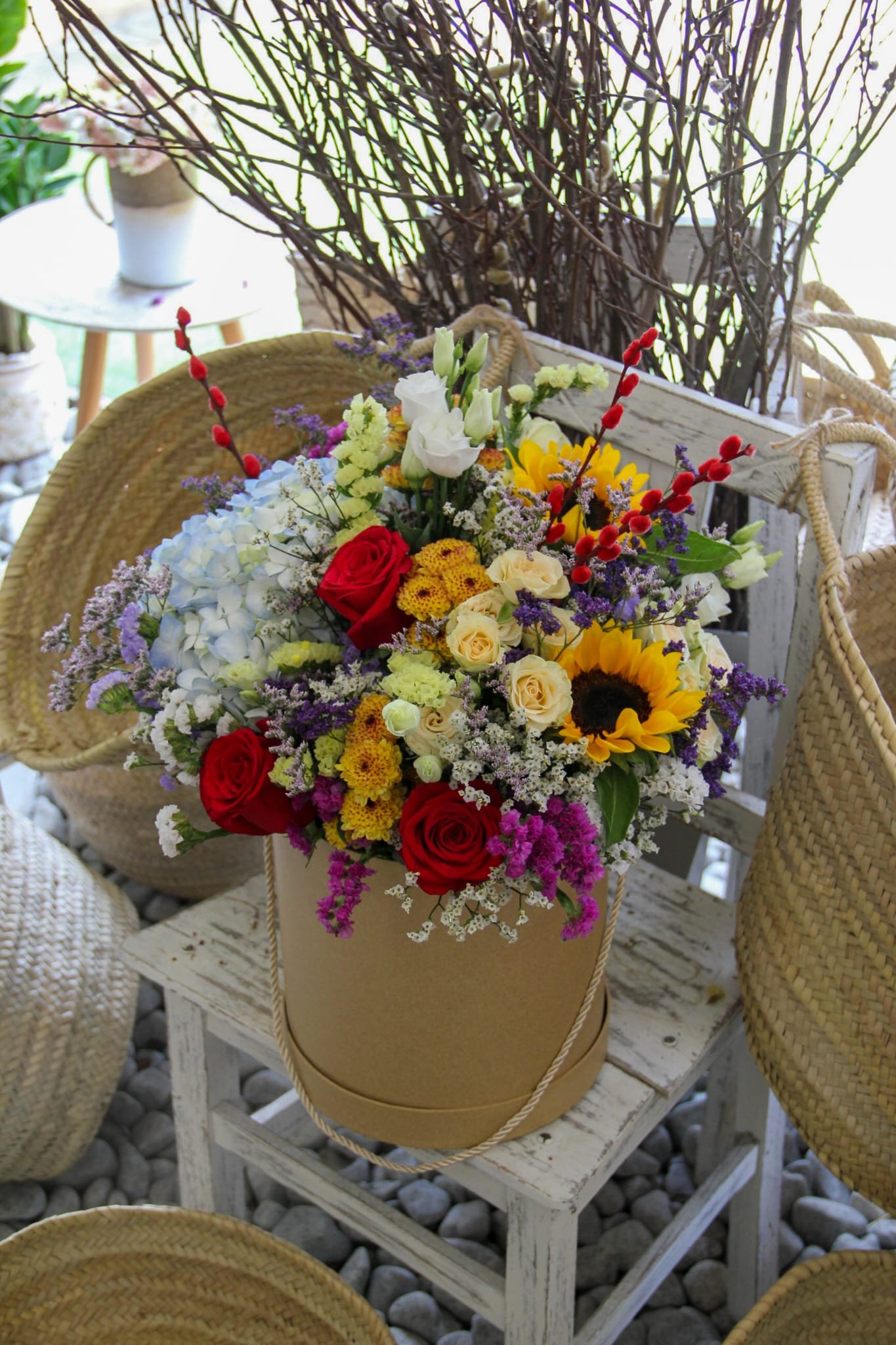 Composto por flores vermelhas intensas, girassóis radiantes, flores azuis delicadas, tons de amarelas e uma seleção rica de flores do campo, este arranjo é apresentado em uma caixa cilíndrica sofisticada que valoriza ainda mais sua beleza.