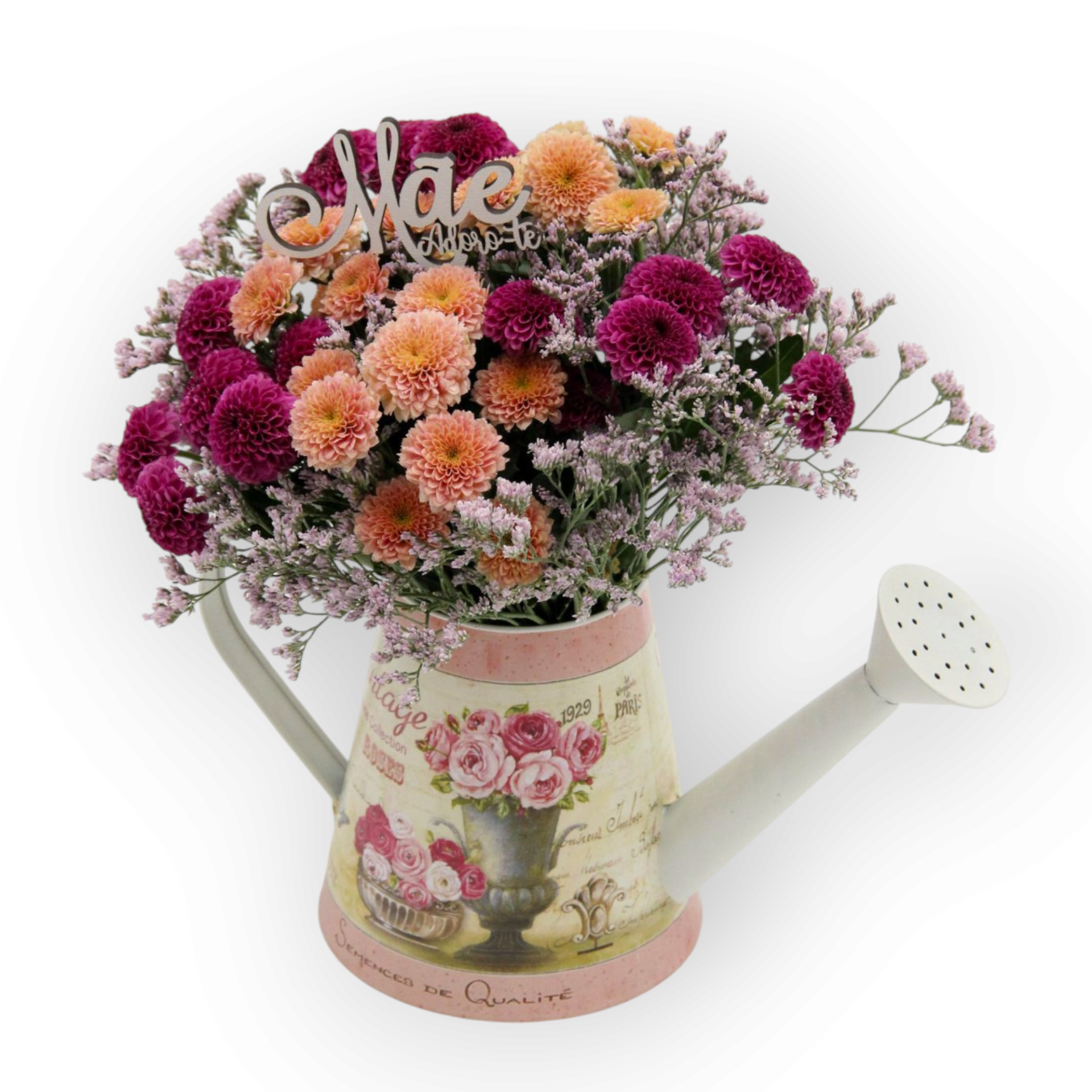 Uma prenda cheia de ternura e beleza natural. Essa charmosa jarra em formato de regador traz um arranjo delicado de mini-margaridas, em tons suaves e vibrantes que encantam à primeira vista.