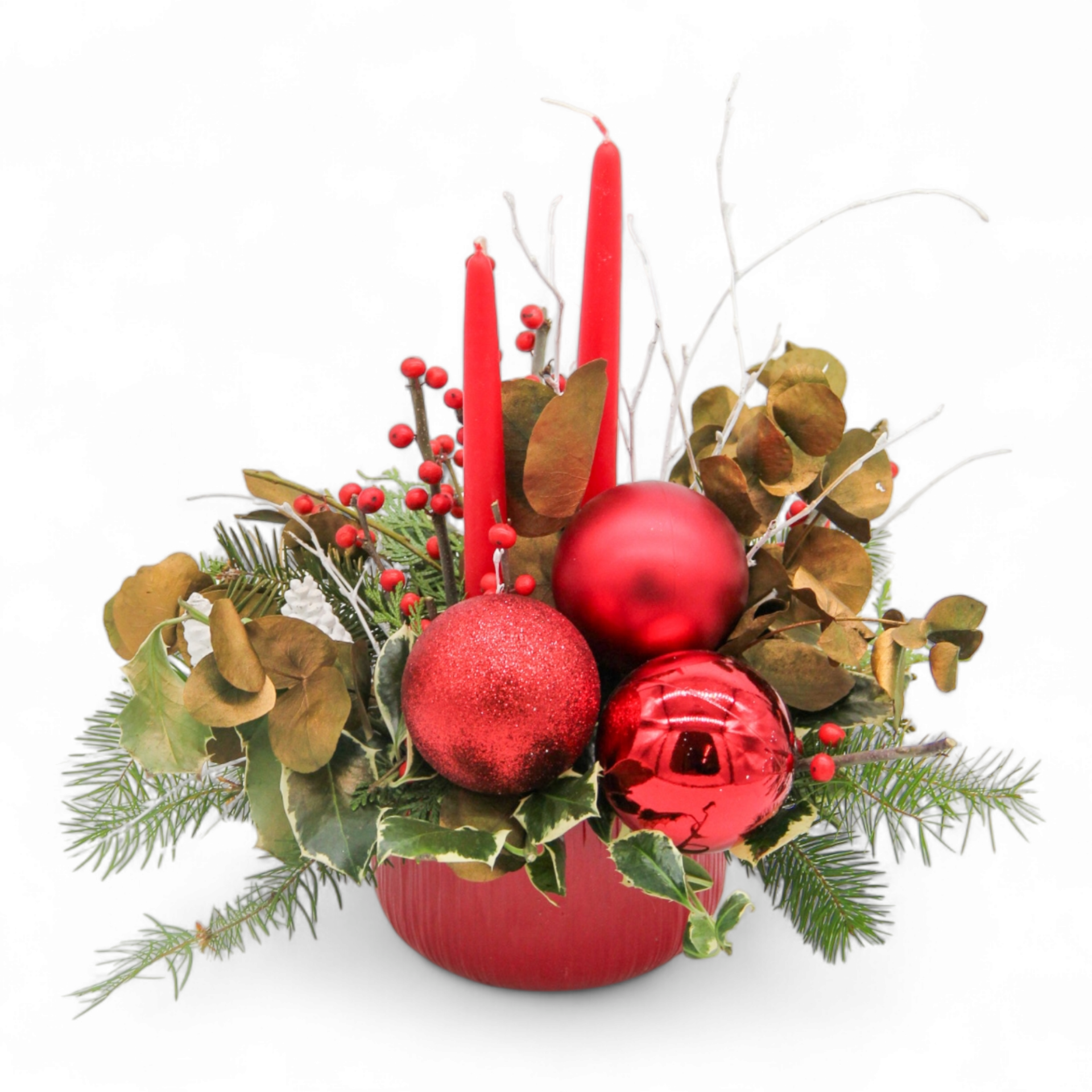 Lindo arranjo composto com Velas vermelhas, pinheiro, eucalipto, ilex, azevinho e bolas natalinas