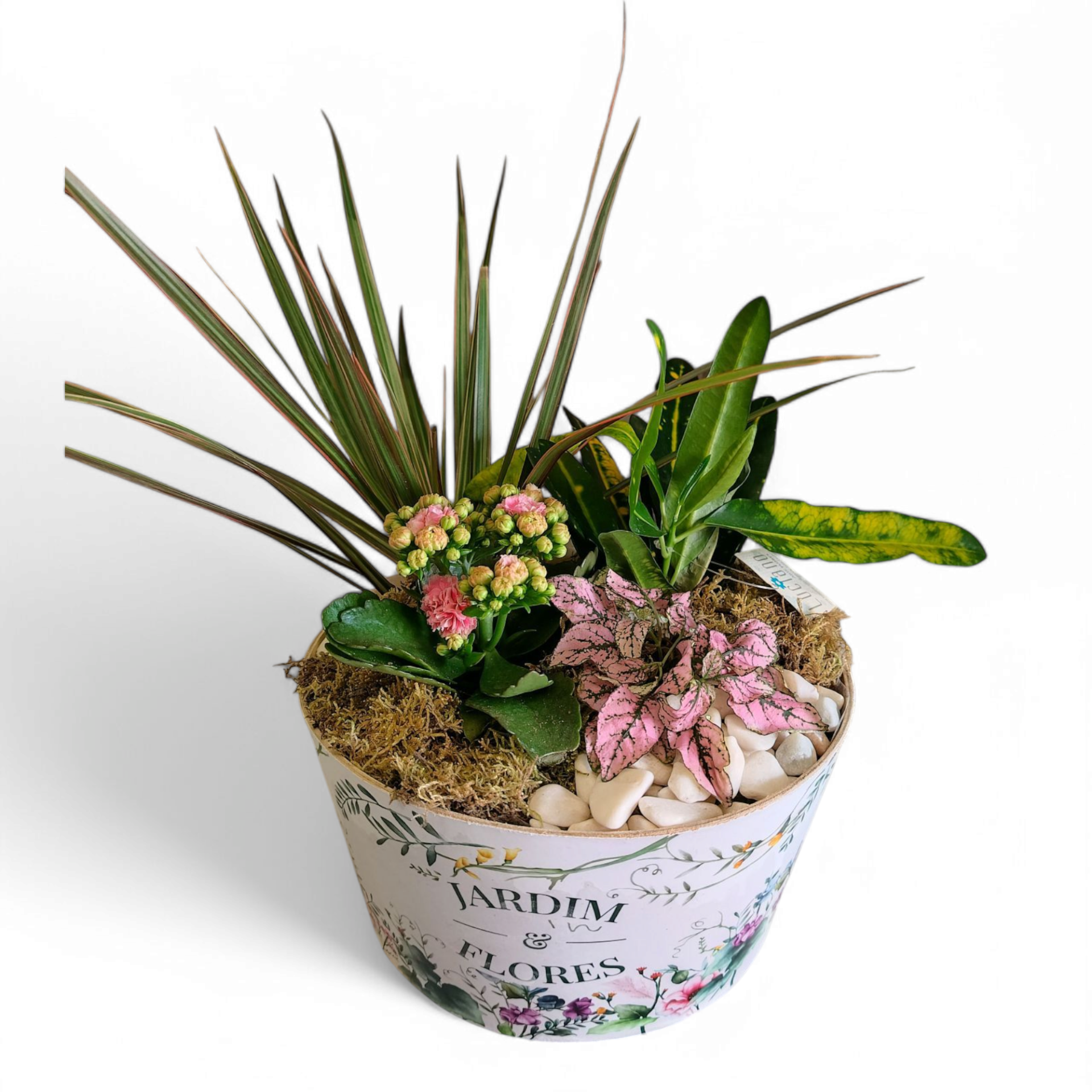 Lindo Arranjo de Plantas Naturais diversas em caixa decorativa floral revestida.