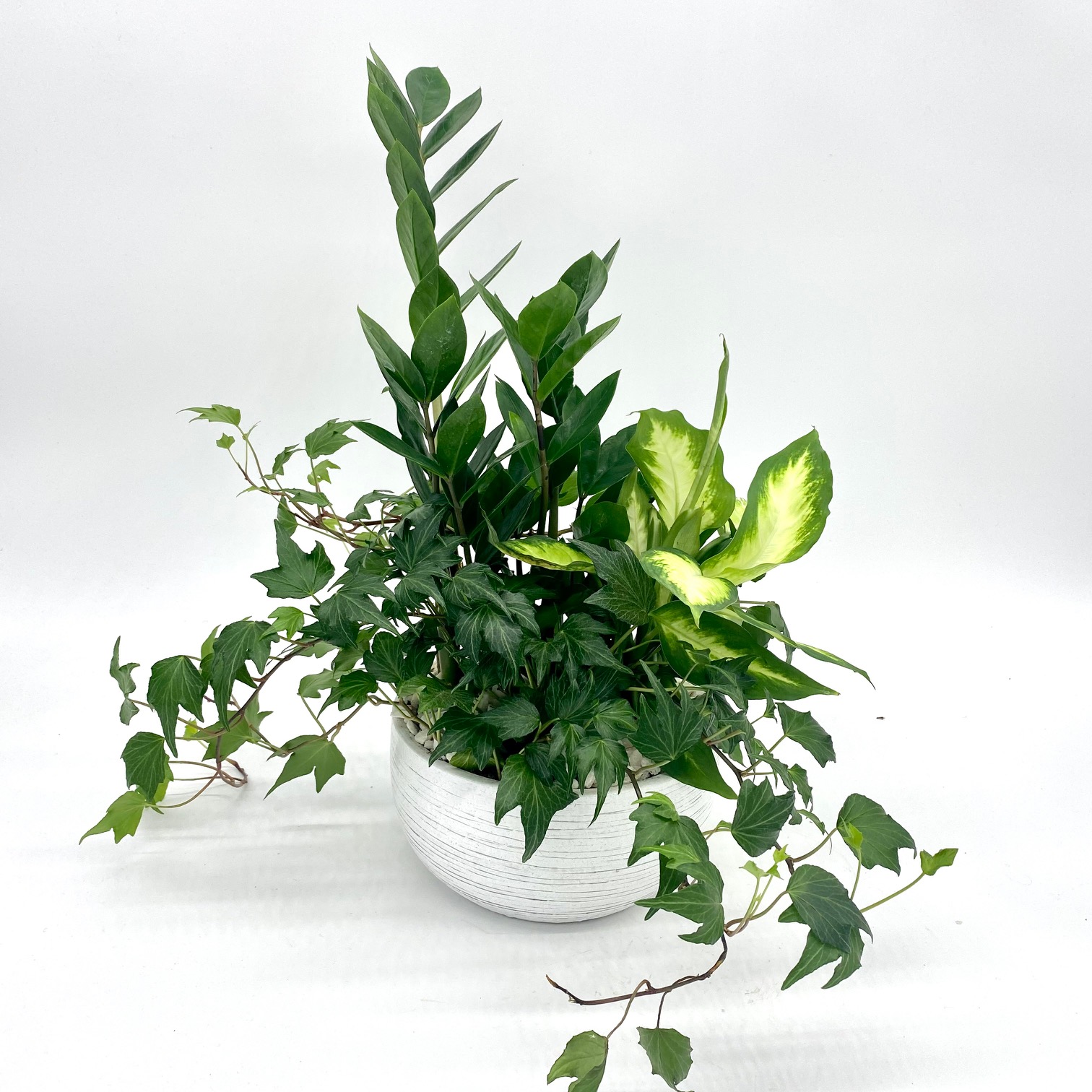 Arranjo com plantas naturais e vaso cerâmico. Plantas sortidas.