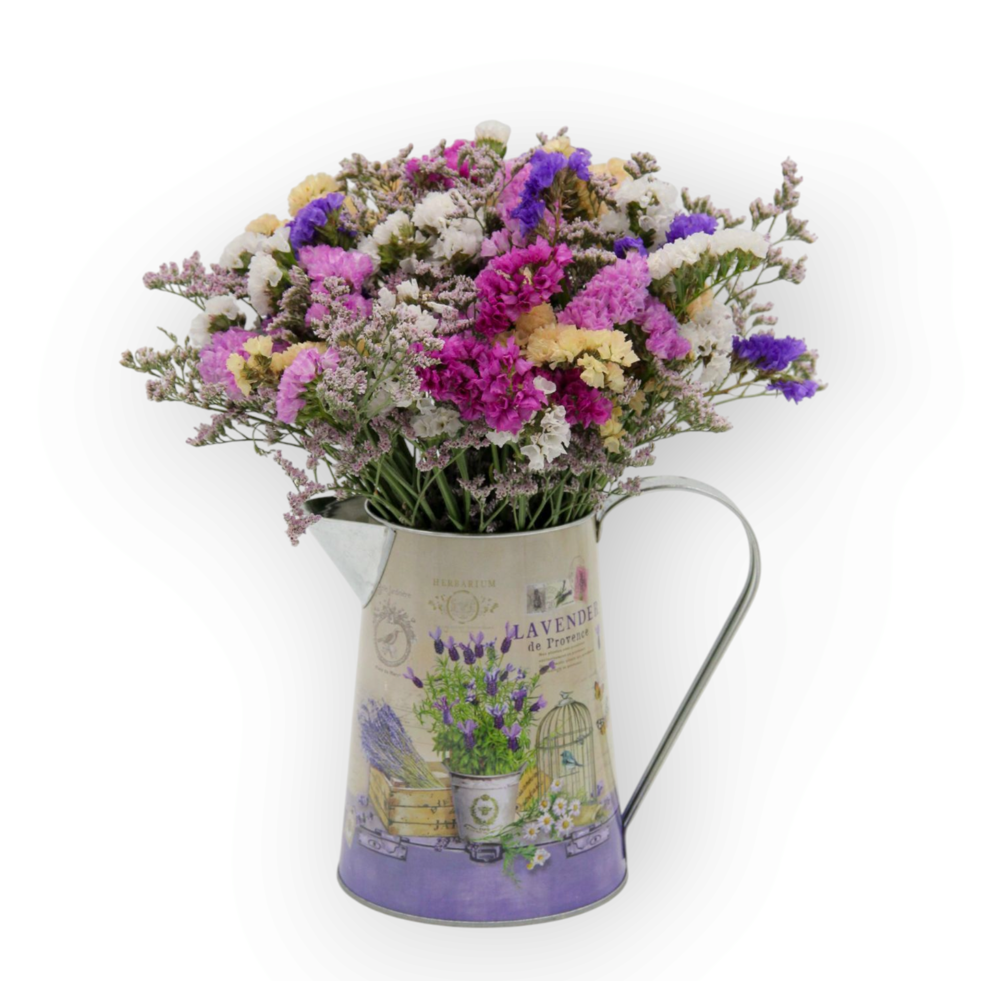 Um presente cheio de ternura e beleza natural. Essa charmosa jarra em formato de Regador com estampa traz um arranjo delicado de limónio e statice naturais, em tons suaves e vibrantes que encantam à primeira vista.
