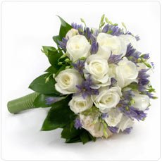 Bouquet de noiva constituído por Rosas brancas rodeado de verduras.