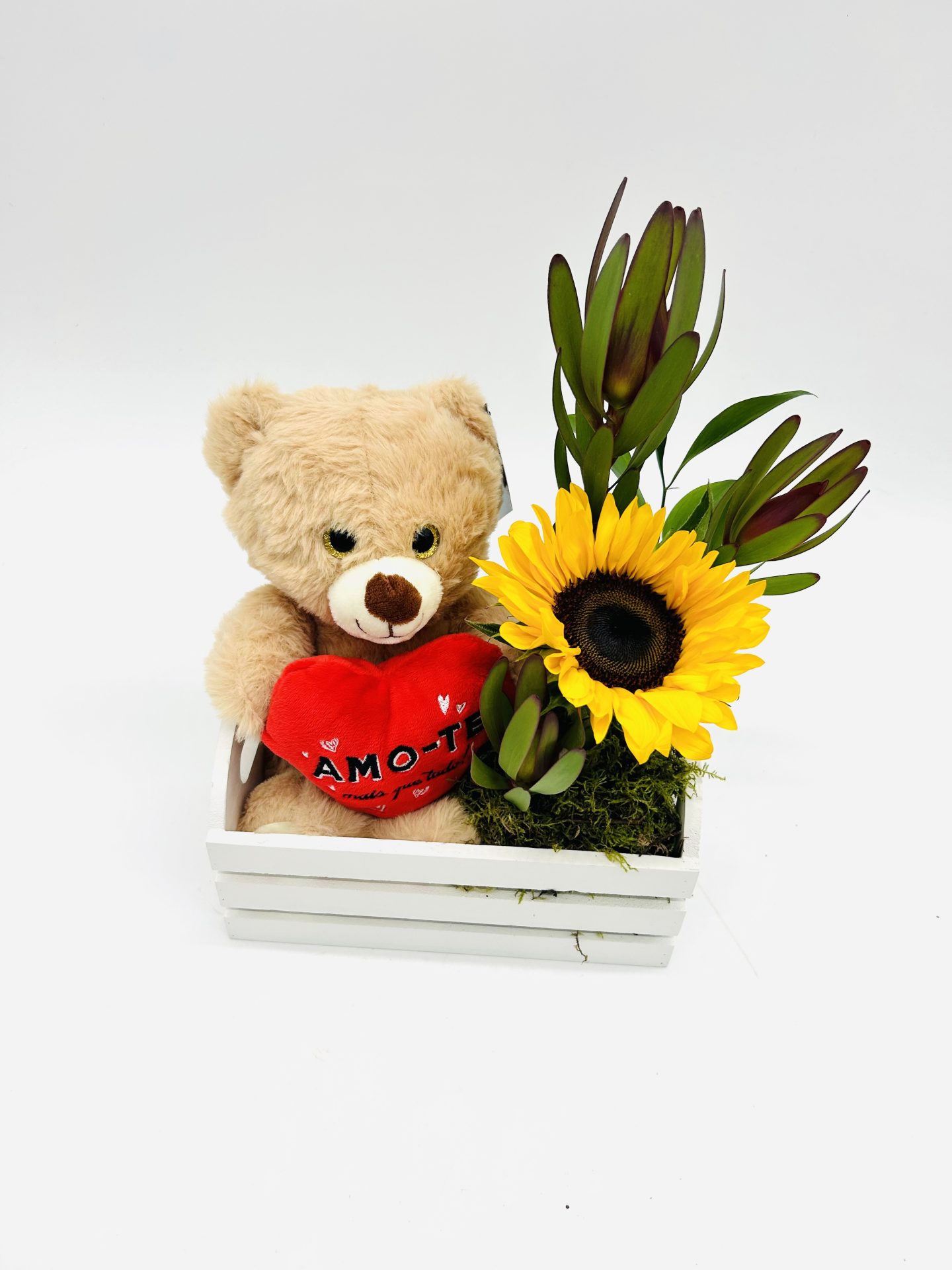 Linda caixa de madeira com Girassol e verdes, acompanhado de um peluche a dizer “Amo-te, mais que tudo!”.