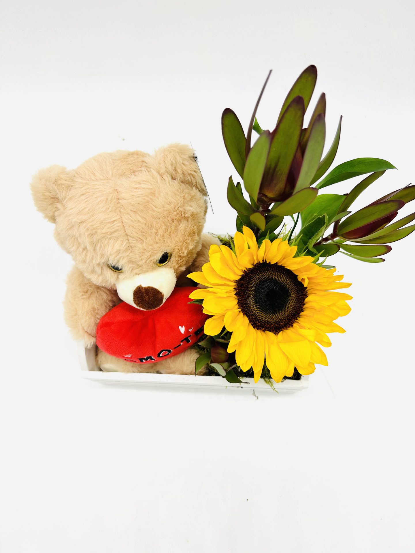 Caixa de madeira com peluche de 20cm, e girassol com verdes.