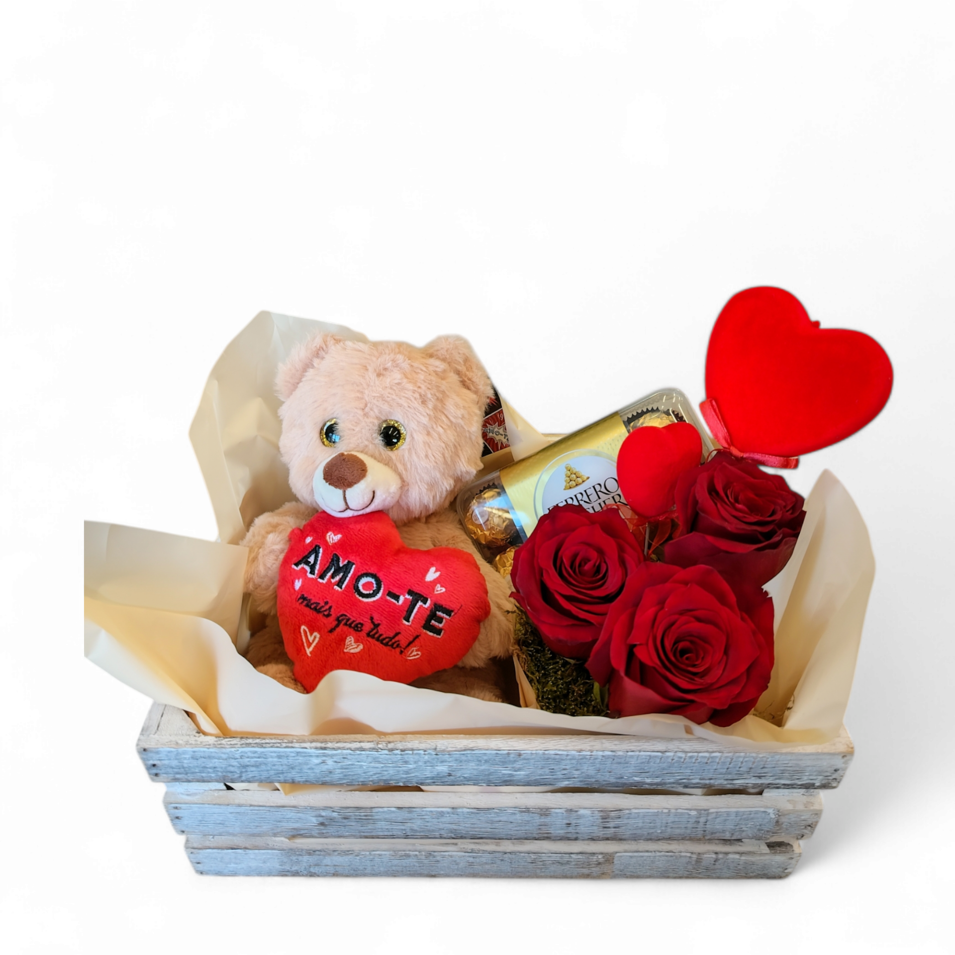 Composto por: Caixa de Madeira, Peluche com dedicatória, Chocolate Ferreiro Rocher (16und), 3 Rosas Vermelhas Naturais, 2 detalhes de coração