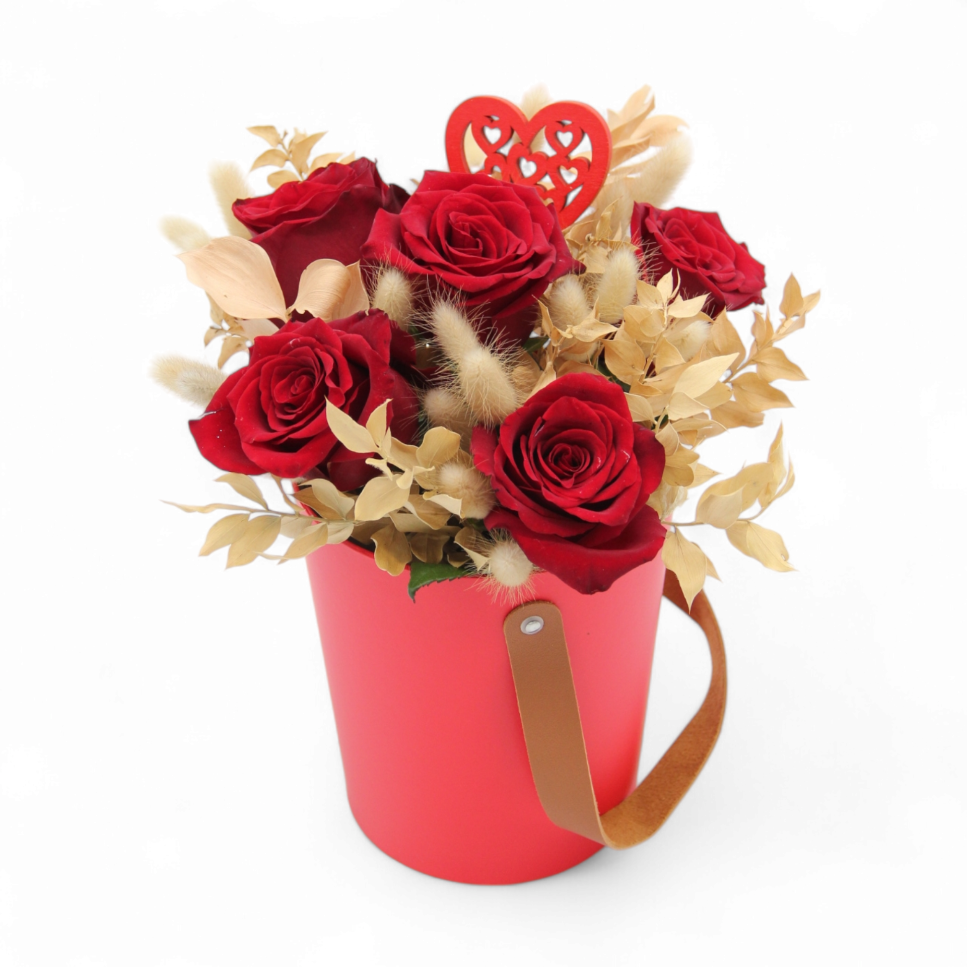 Linda Caixa Romântica com Rosas Vermelhas e Secos em tons Bege Claro e um detalhe Carinhoso de Amor