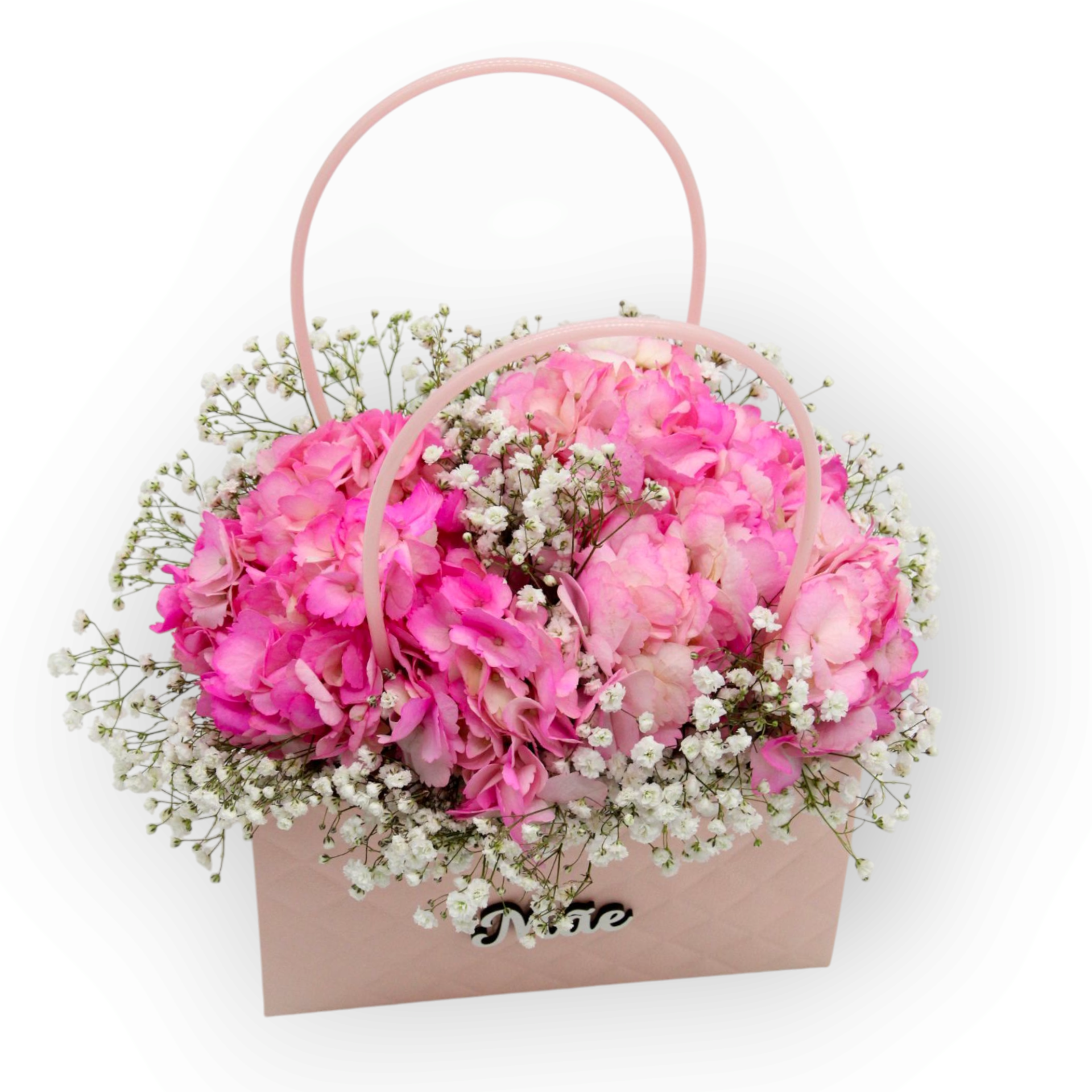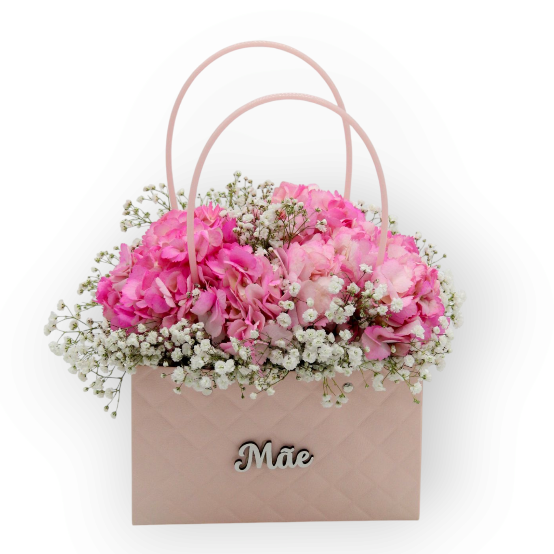 Uma homenagem delicada, romântica e cheia de afeto. Este arranjo encantador traz hortênsias cor-de-rosa combinadas com a leveza das gypsophilas, em uma charmosa embalagem em formato de mala com a palavra “Mãe” em destaque.