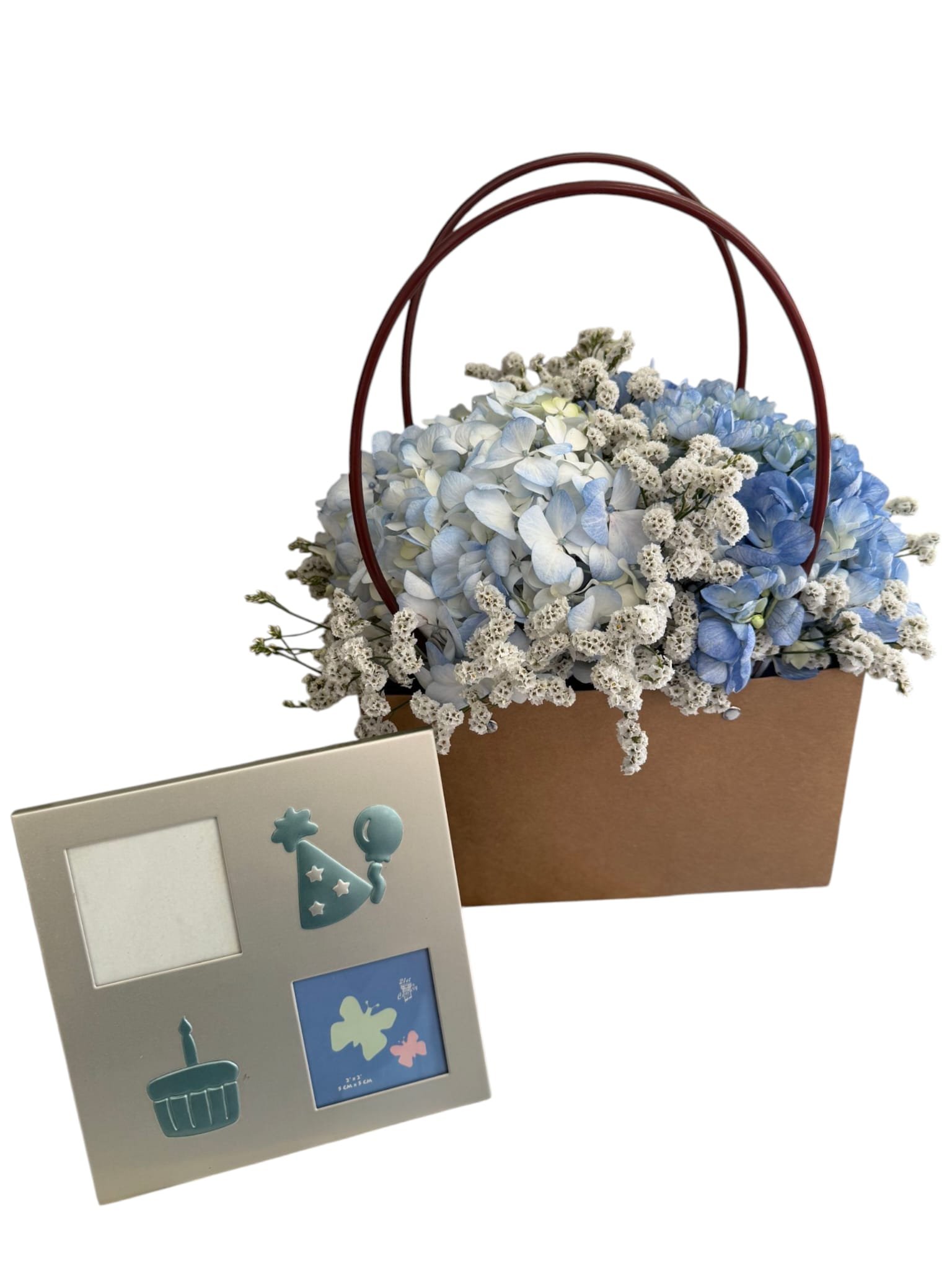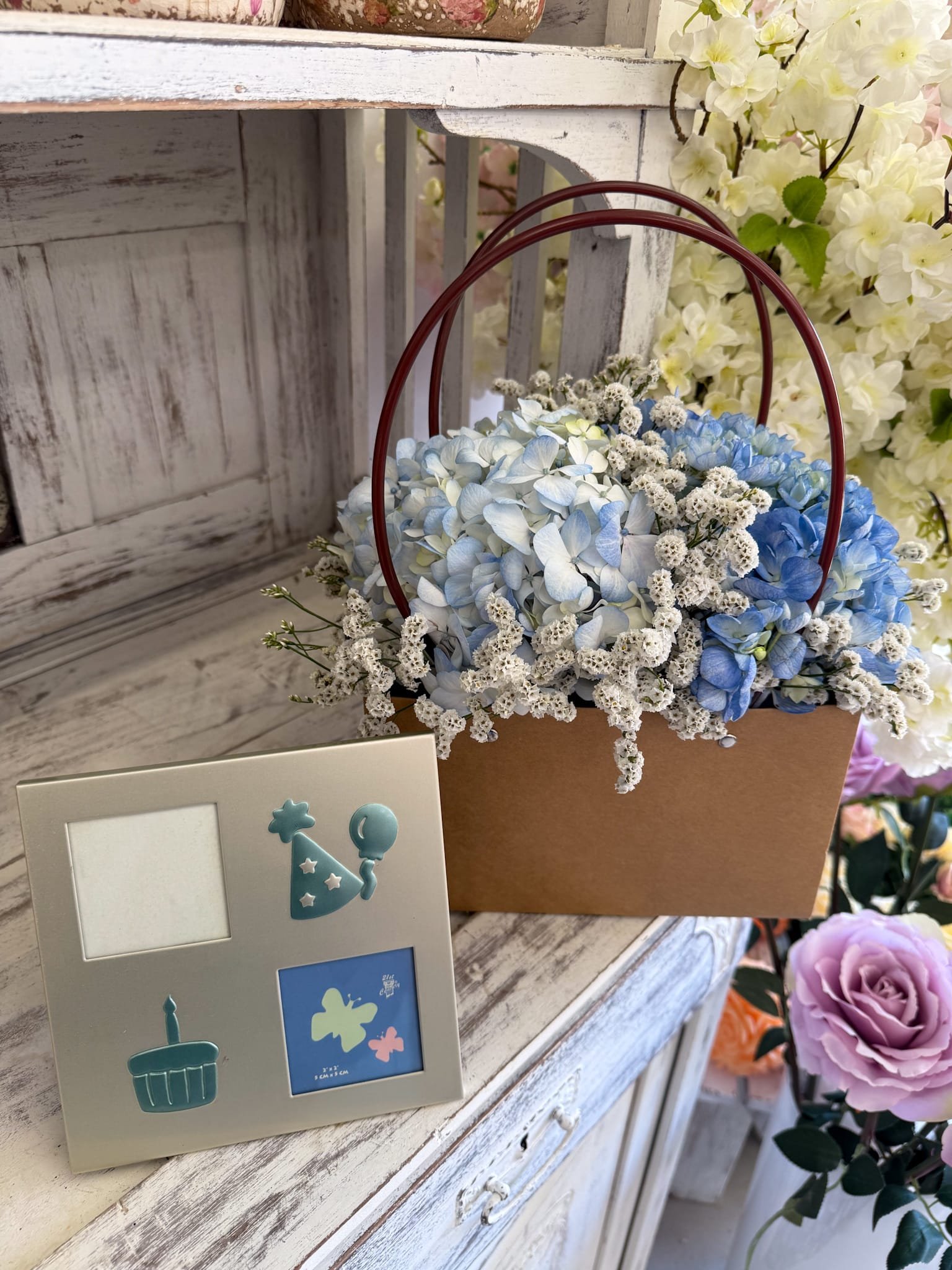 O arranjo é composto por flores em tons de Azul e branco, cuidadosamente dispostas em uma charmosa sacola de papel kraft com alças. Acompanha um porta-retrato temático infantil, com detalhes em alto-relevo de ursinhos em rosa claro, ideal para guardar a primeira foto do bebê ou uma lembrança marcante da infância.