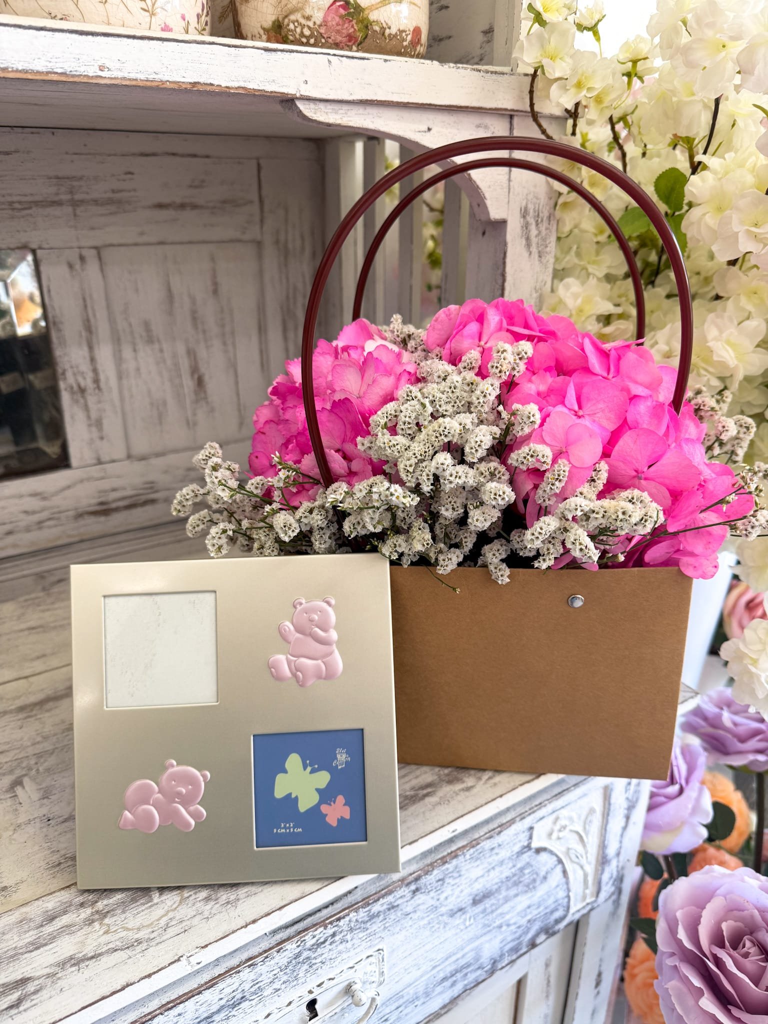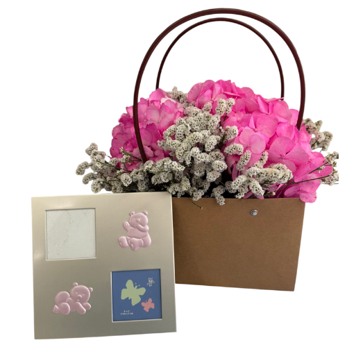 O arranjo é composto por flores em tons de cor-de-rosa e branco, cuidadosamente dispostas em uma charmosa sacola de papel kraft com alças. Acompanha um porta-retrato temático infantil, com detalhes em alto-relevo de ursinhos em rosa claro, ideal para guardar a primeira foto do bebê ou uma lembrança marcante da infância.