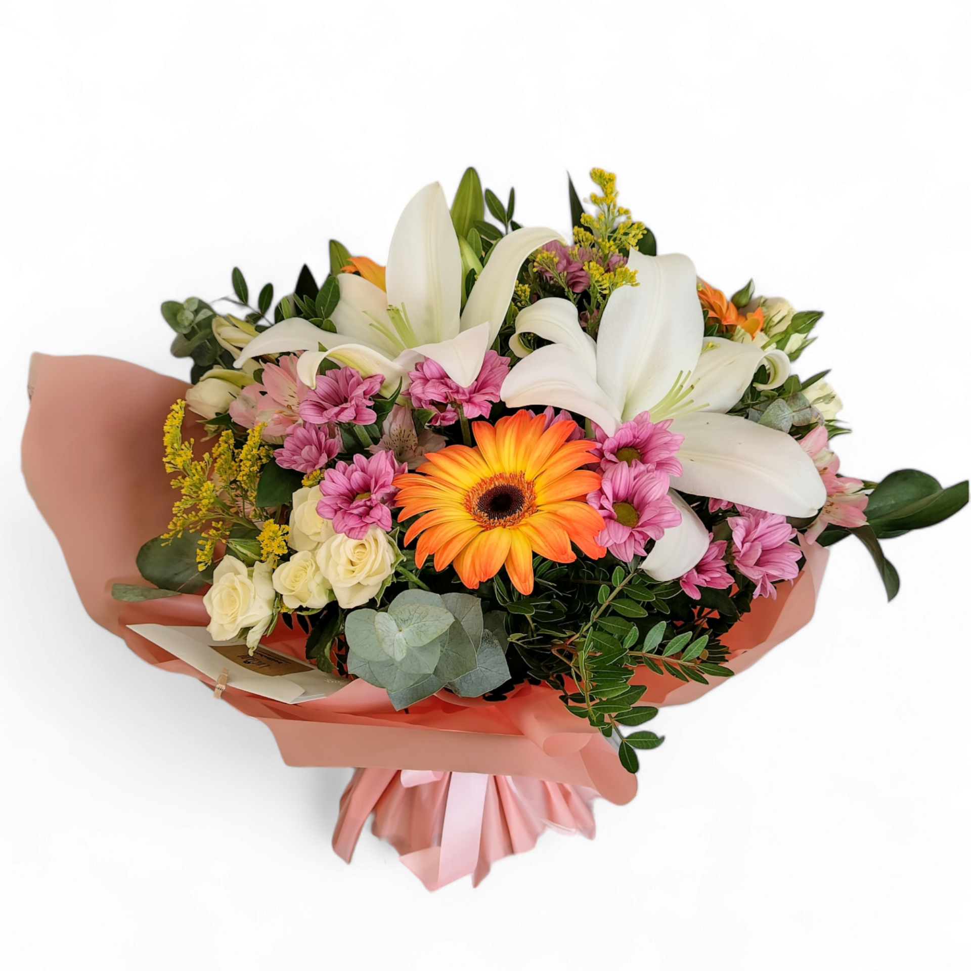 O Ramo Amoroso é uma delicada combinação de flores brancas e rosa claro, simbolizando amor eterno e ternura. Este arranjo é perfeito para presentear em ocasiões especiais, transmitindo uma mensagem profunda de afeto e carinho.