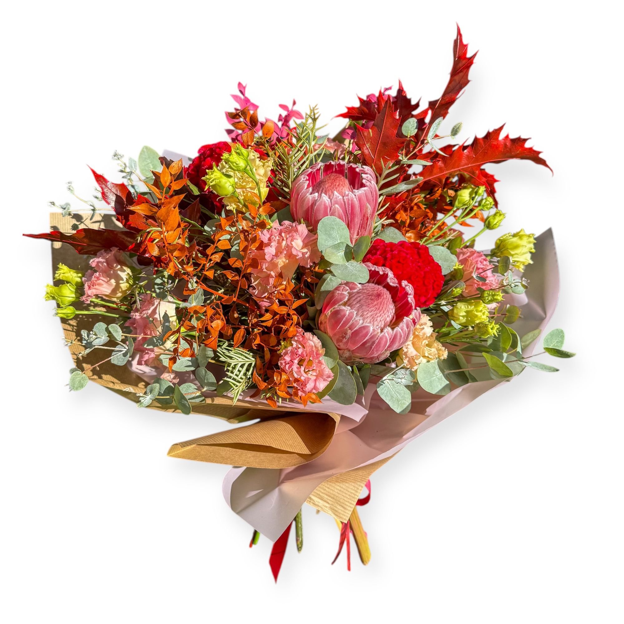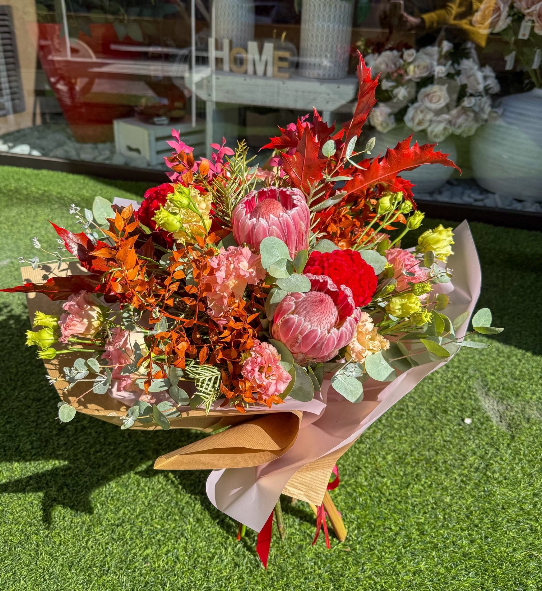 Ramo com flores Sazonais da estação do ano, seus tons e flores tem referência ao outono, sendo um ramo composto com tons terrosos, alaranjados e toques de cor-de-rosa