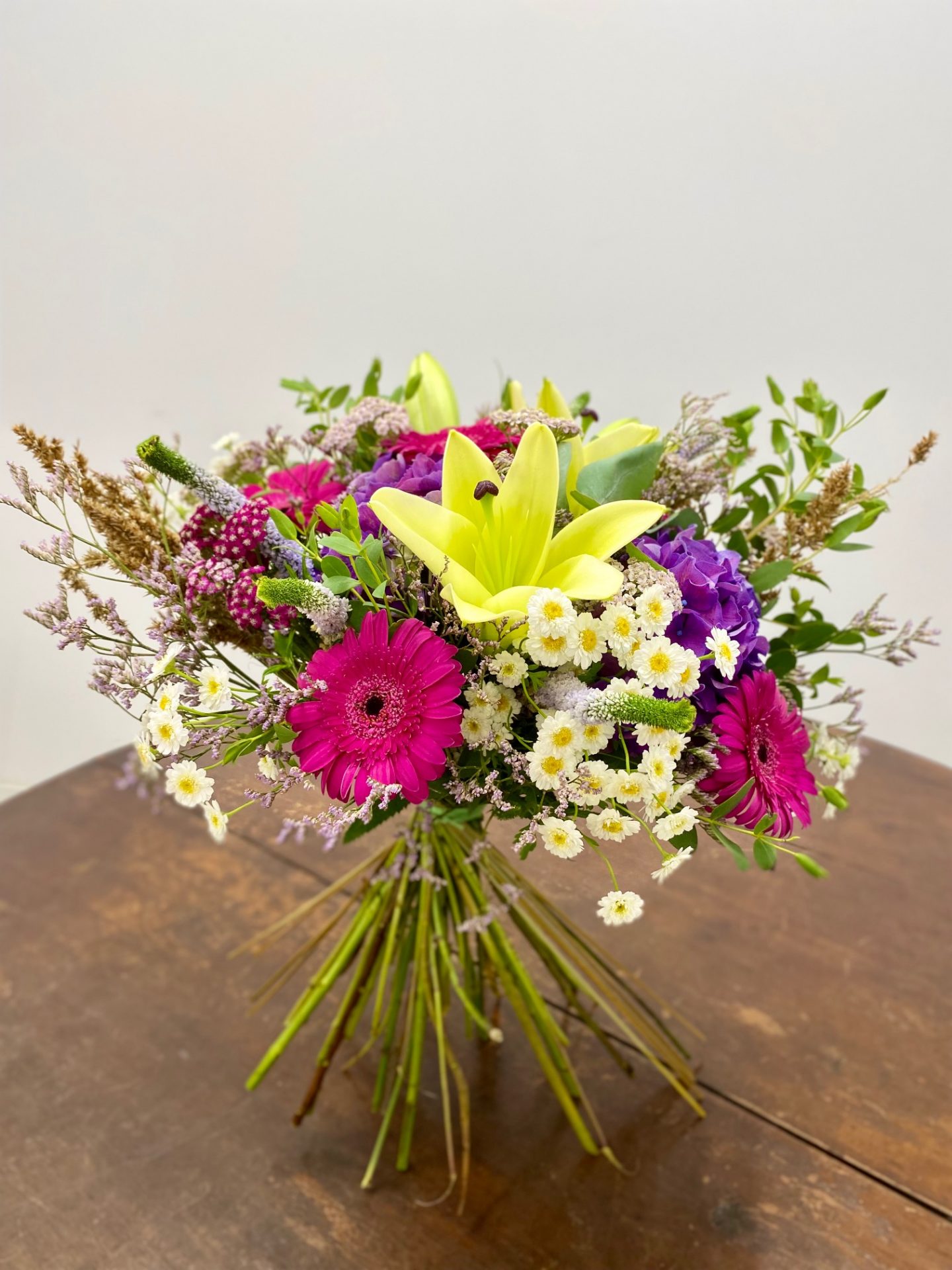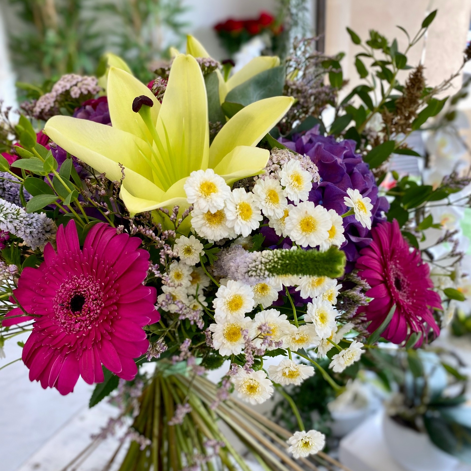 Ramo felicidade com flores variadas em tons verdes e rosa
