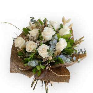 Um ramo sofisticado que combina flores brancas com tons terrosos e folhas de eucalipto, criando um equilíbrio perfeito entre leveza e calor. Os detalhes em vermelho queimado e castanho acrescentam profundidade e textura, tornando este arranjo ideal para oferecer ou decorar espaços com elegância natural.