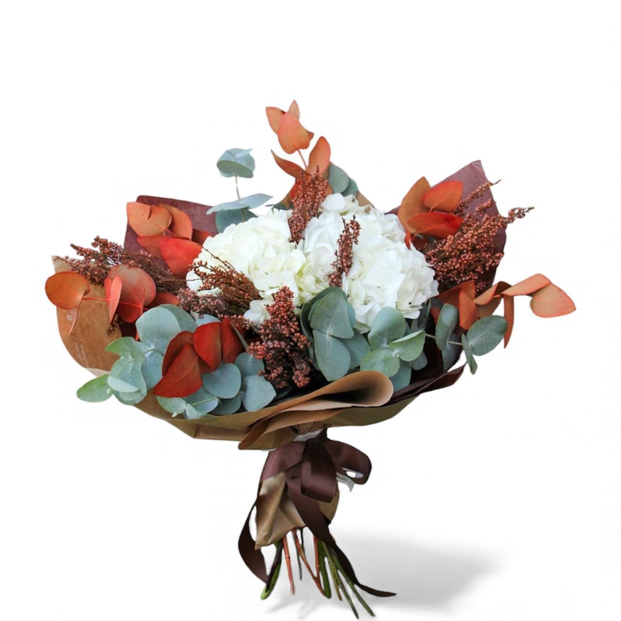 Um ramo sofisticado que combina flores brancas com tons terrosos e folhas de eucalipto, criando um equilíbrio perfeito entre leveza e calor. Os detalhes em vermelho queimado e castanho acrescentam profundidade e textura, tornando este arranjo ideal para oferecer ou decorar espaços com elegância natural.