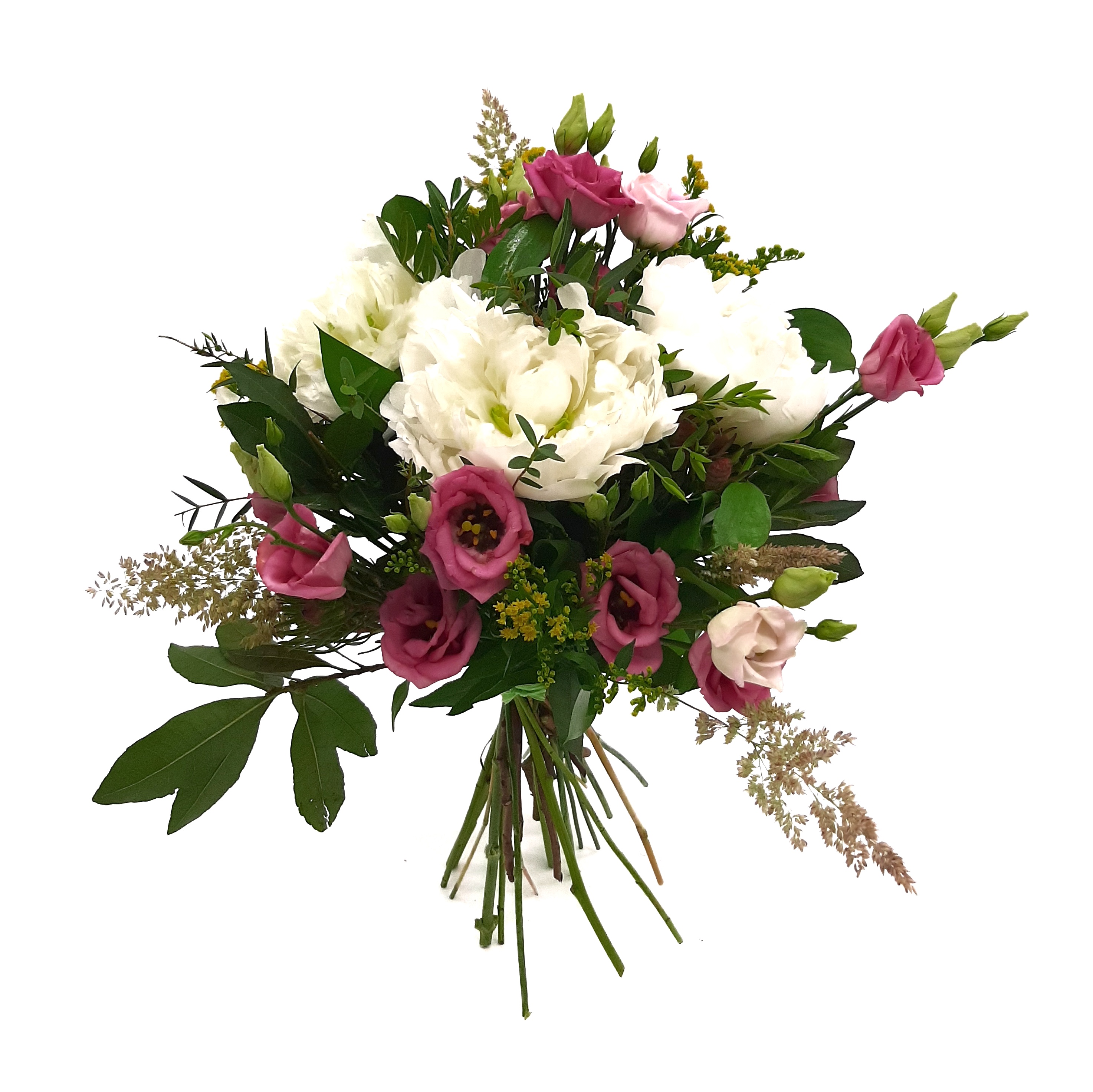 Ramo com peónias brancas ou rosa e flores campestres variadas nos mesmos tons.