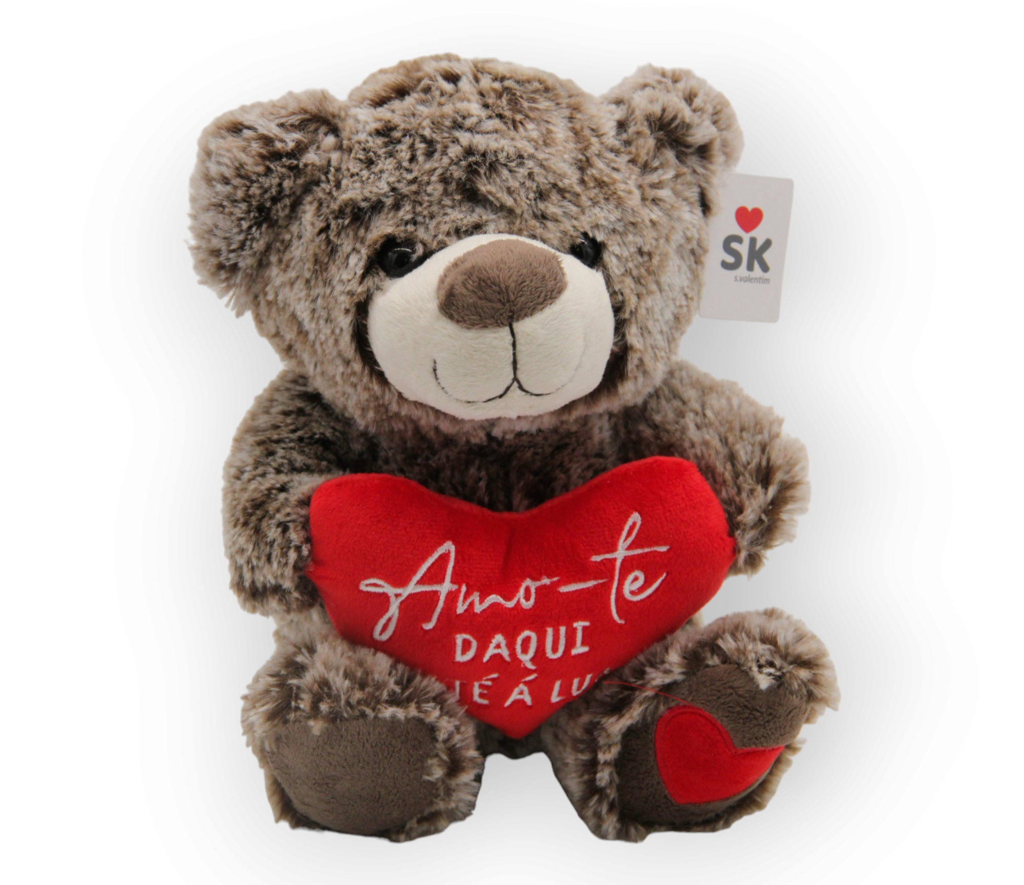 Urso de 30cm com coração e frase romântica, ideal para oferecer junto a um lindo arranjo floral.